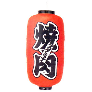 『焼肉』の長提灯です! 提灯の骨組みとなる竹骨が表現され風合いは紙提灯とよく似てていますが、当商品はビニール製ですので雨の日でも安心です♪